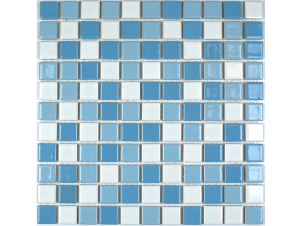 A blend of two blues and a white high gloss glazed ceramic mosaic in a 25 x 25 mm format.